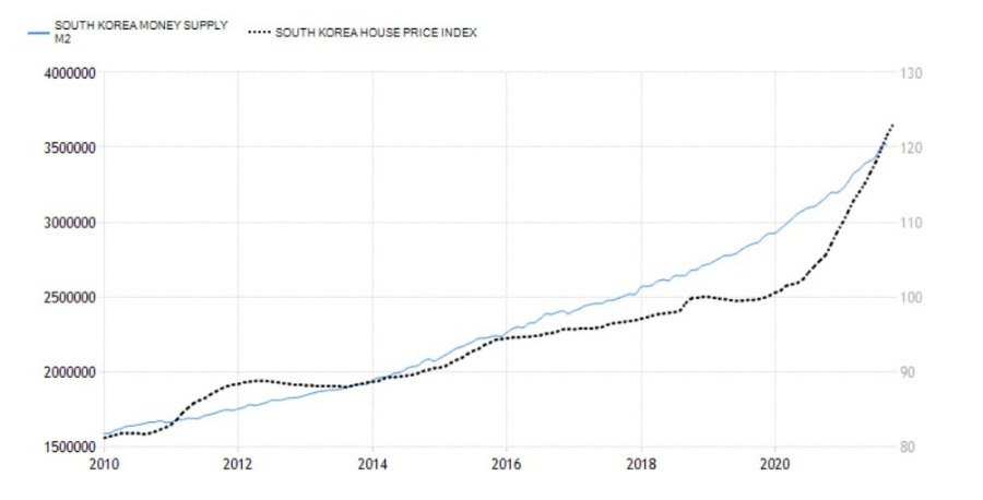 정부가 돈을 찍어내고 통화량이 늘어나면 집값도 오른다.